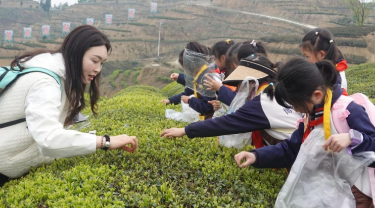 绿意层叠的茶园里,孩子们化身“小茶农”,兴致勃勃地穿梭在茶树间。他们低着头、弯着腰,小心翼翼地摘下嫩芽,放进竹篓,专注又认真